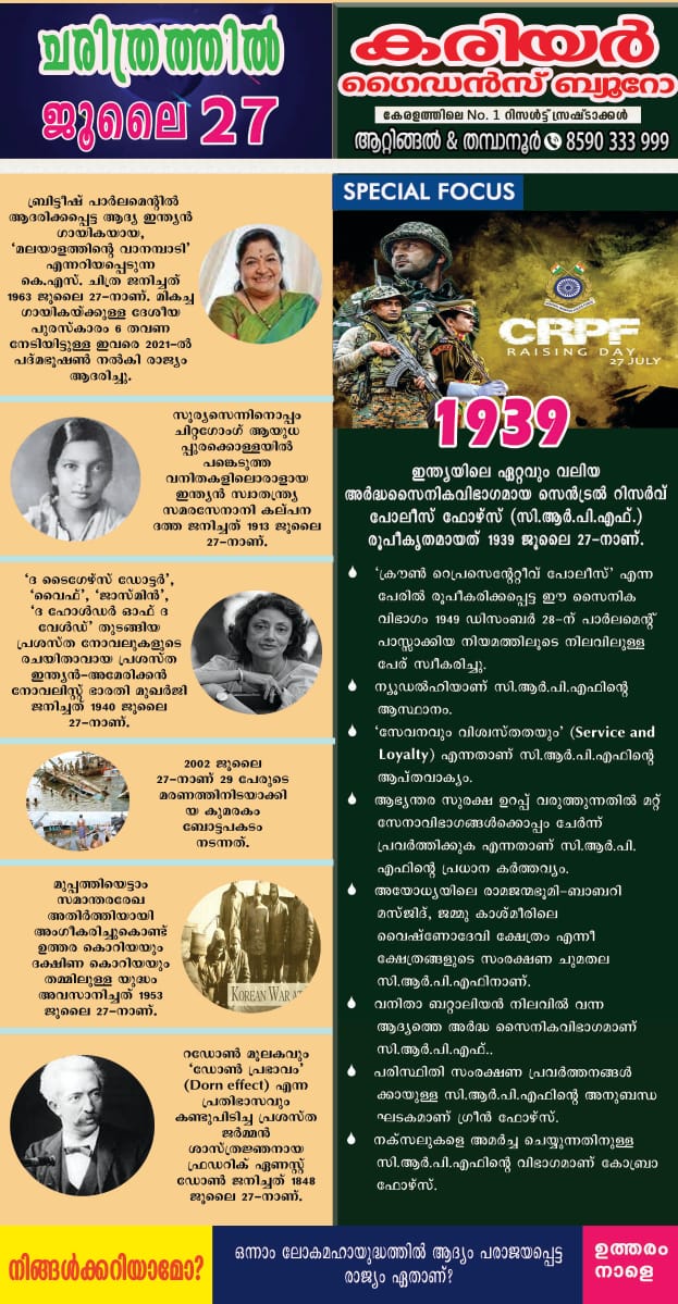 à´šà´°à´¿à´¤àµà´°à´¤àµà´¤à´¿àµ½ ഇനàµà´¨àµ (JULY 27)